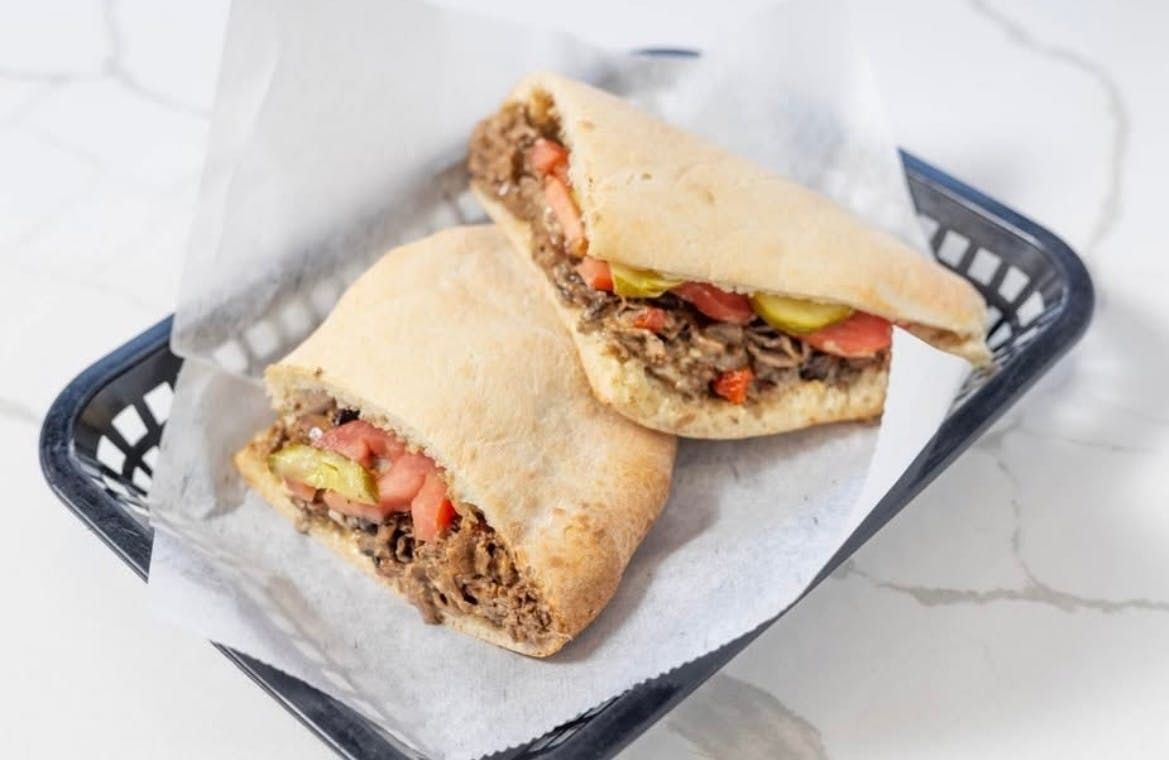 Shaved steak, mushrooms, onions, fire roasted red peppers, garlic mayo, American cheese, tomatoes, pickles, hots in a pocket